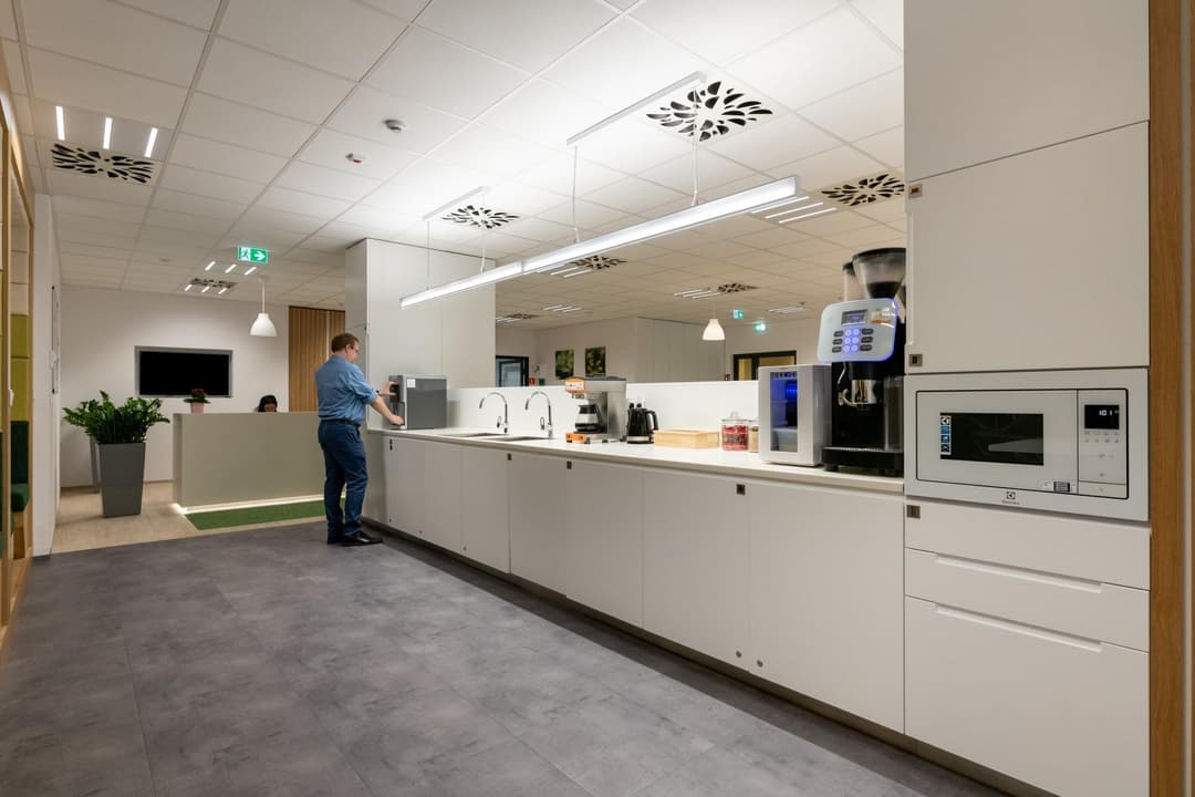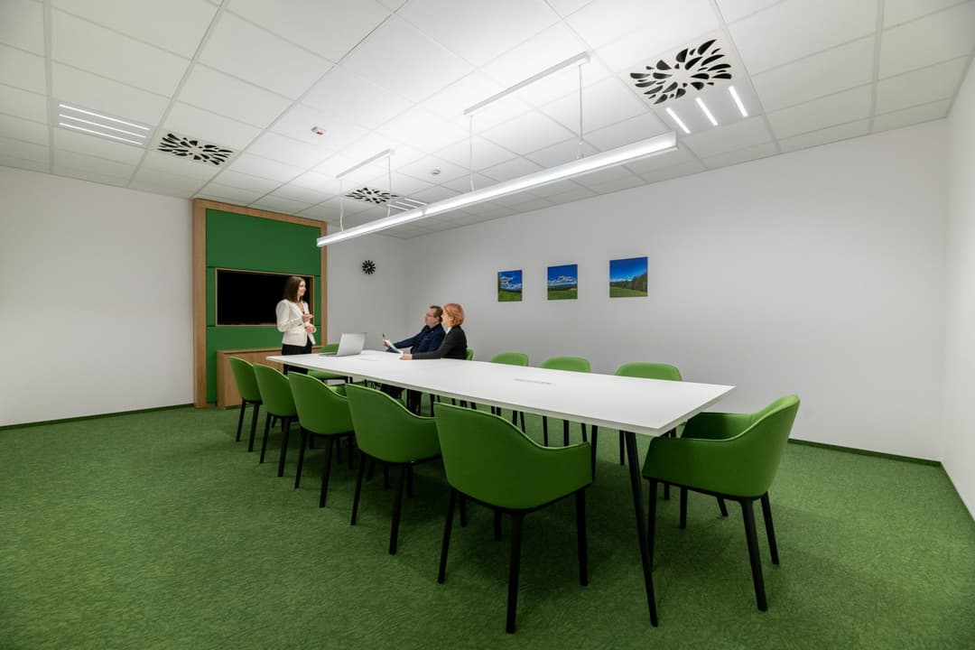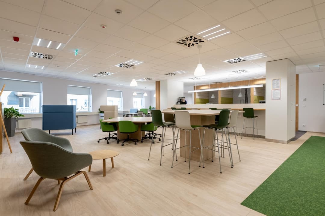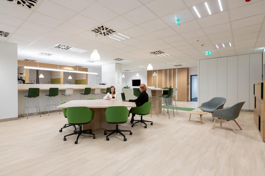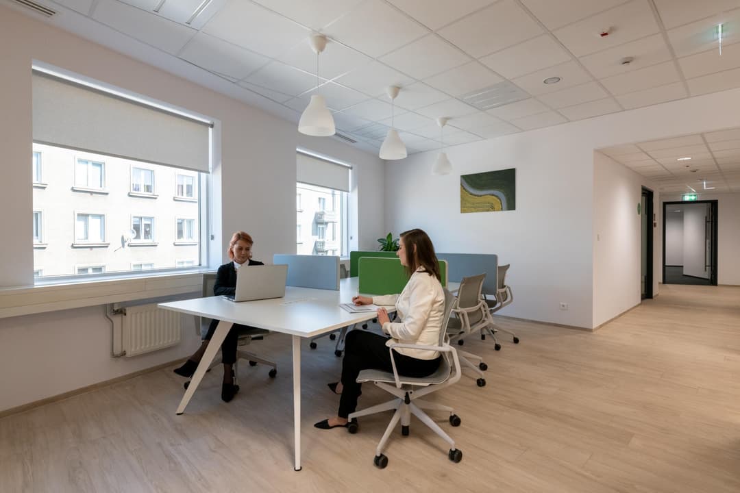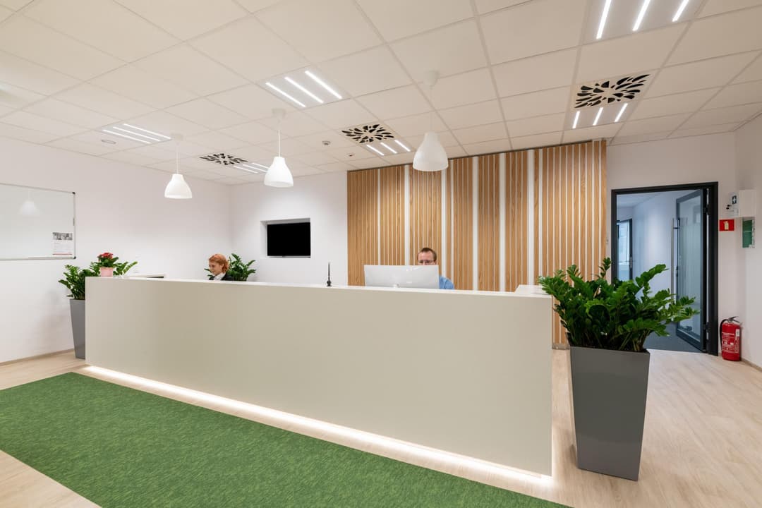 The offices here are fully furnished and come in a range of sizes, suitable for teams from one up to six people. For example, a 1-person office is available for 1 825,00 PLN per workstation, while a 5-person space is 797,00 PLN per workstation. There’s also a discount for smaller teams renting larger spaces, with a reduced service fee for coffee, tea, and water based on the actual team size. The workspace features a shared kitchen, reception area, and three meeting rooms. A professional on-site team takes care of daily needs, from handling mail and printing to greeting guests.