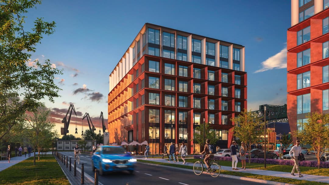 Palio Office Park D is an office building located on Jana z Kolna in the Młyniska district of Gdańsk. The property is part of a larger office and service complex situated on the historic grounds of the Gdańsk Shipyard, right by one of the city’s main arteries. The development draws inspiration from the area’s industrial past, with building facades featuring composite panels in a rust-like color and water features running along much of the exterior, creating a unique connection to the shipyard’s heritage.