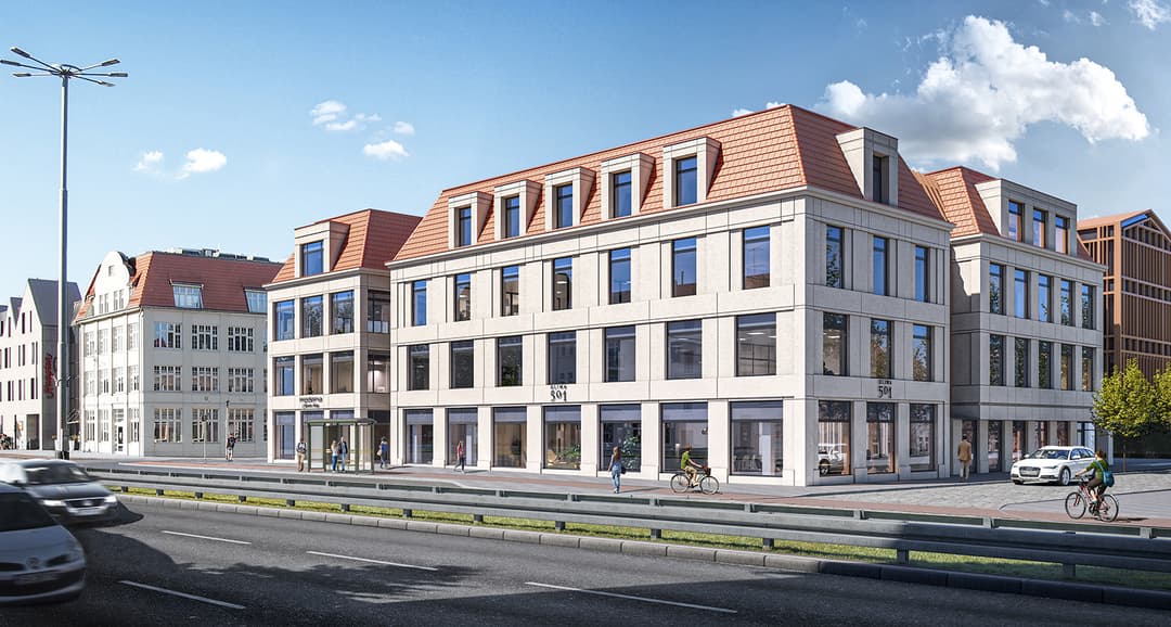 Oliwa 501 is an office building located at Grunwaldzka 501 in the Oliwa district of Gdańsk, surrounded by the unique charm of historic architecture and the energy of a growing business hub. The building’s design draws inspiration from the classic townhouses of the area, with sloped roofs and decorative verandas that blend into the neighborhood’s character. Inside, the office spaces are arranged around a green patio, creating a peaceful spot for breaks or informal meetings, while the building’s four floors offer a total of 5 400 m² of space, including 3 300 m² dedicated to service units.