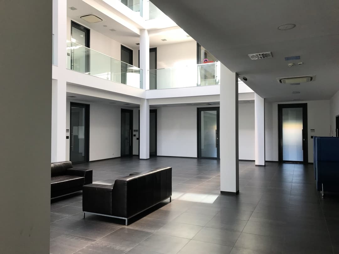 Inside, the building features a bright lobby with skylights and functional office spaces that can be arranged as open space or divided into private rooms. Large windows let in plenty of daylight, and the offices have windows that open for fresh air. There’s also a shared kitchen available for tenants, making it easy to grab a coffee or lunch without leaving the building.