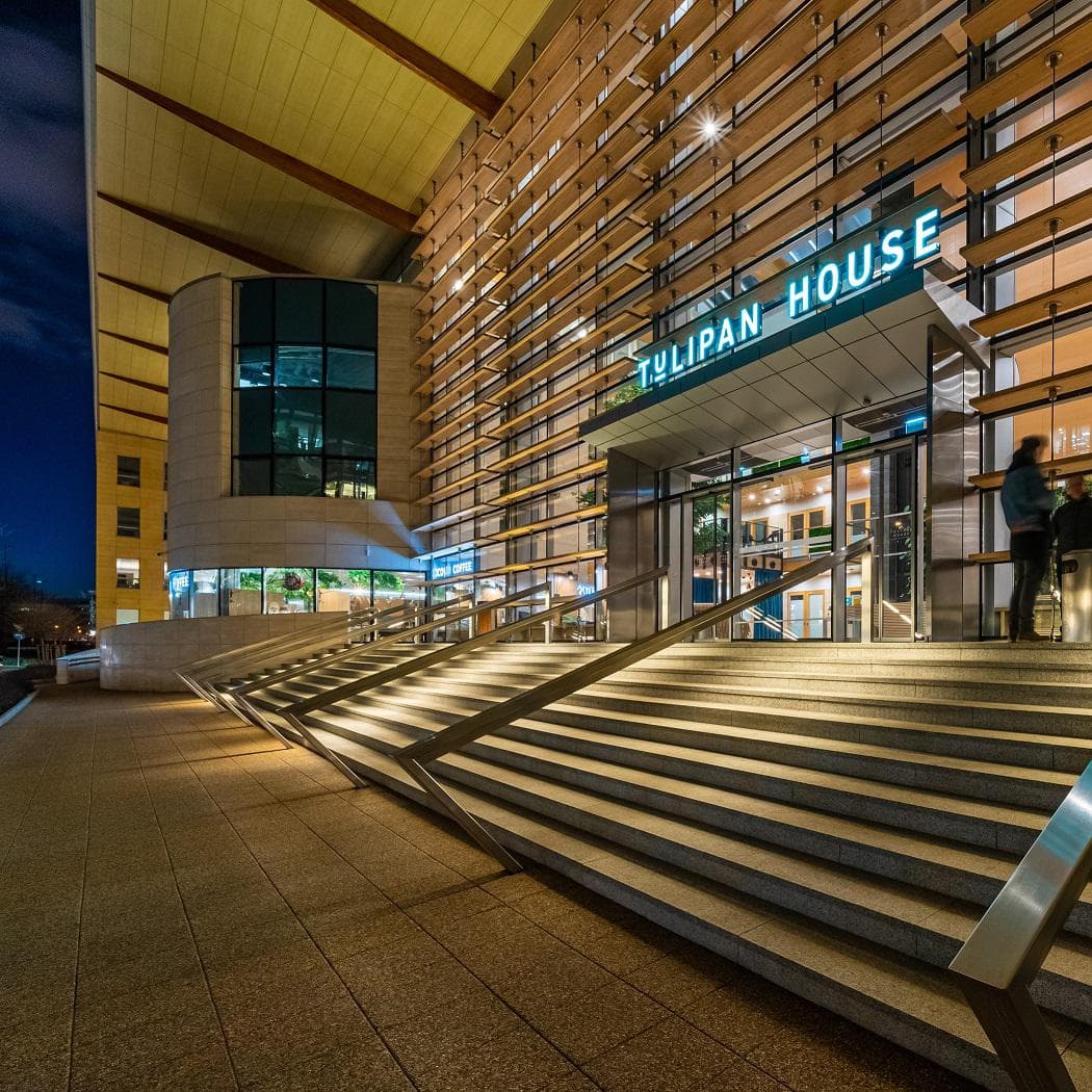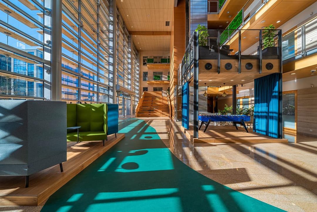 Discover Tulipan House, an office building located at Domaniewska 50 in Warsaw’s Mokotów district. The building features four floors and offers around 17 500 m² of office space, with a typical floor providing about 4 000 m². Flexible layouts and large windows allow for plenty of daylight and easy adaptation to your team’s needs. The central atrium, filled with greenery and natural light, rises 14 meters and creates a welcoming atmosphere for both employees and visitors.