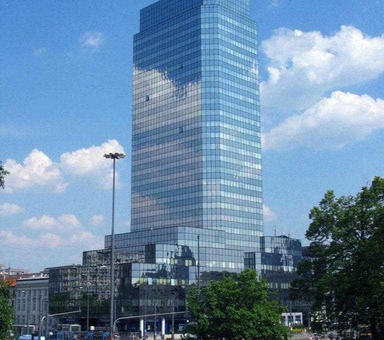 Blue Tower / Błękitny Wieżowiec stands out on the Warsaw skyline with its striking glass façade reflecting the sky, making it one of the most recognizable office buildings in the city. Located at Plac Bankowy 2 in the heart of Śródmieście, this 27-story building offers over 22 000 m² of office space for lease, with flexible layouts that can be tailored to suit different business needs. The lower floors are home to various services, while the upper levels provide comfortable office spaces with plenty of natural light.