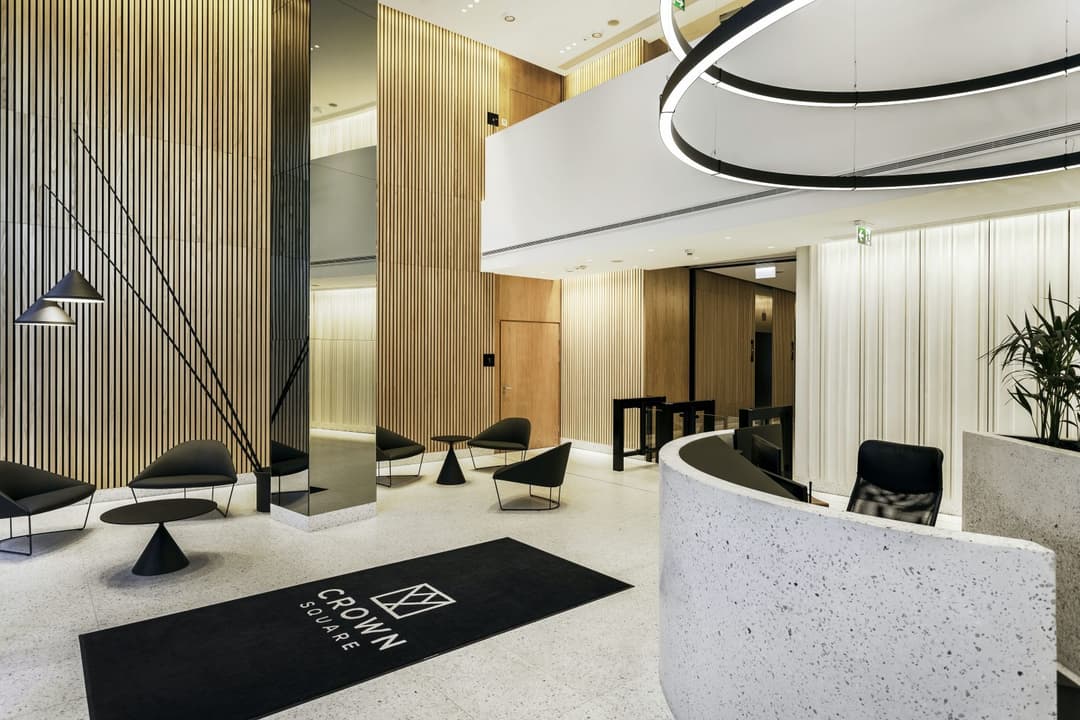 Parking is flexible at Crown Square. Underground spaces are available to rent, and there’s public street parking as well as private lots in the vicinity. The building holds a BREEAM Excellent certification, reflecting its commitment to sustainability.