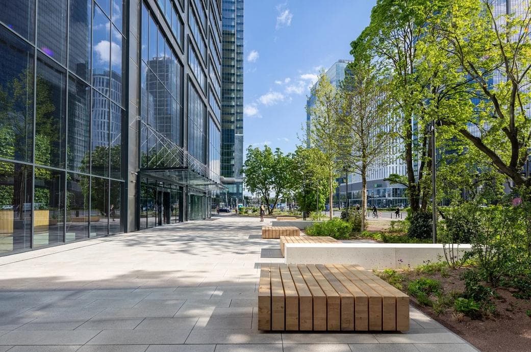 Generation Park X is an office building located at Prosta 36 in the Wola district of Warsaw, right at the intersection of major city arteries. The building is part of a larger office complex, offering a total area of around 82 000 m², with flexible office layouts and plenty of daylight thanks to glass facades. The upper floors provide sweeping views of the Warsaw skyline, and the surrounding area features a green plaza with trees, pergolas, and outdoor seating-perfect for informal meetings or a quick break outside.