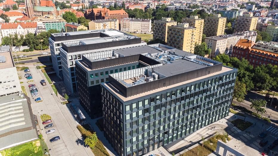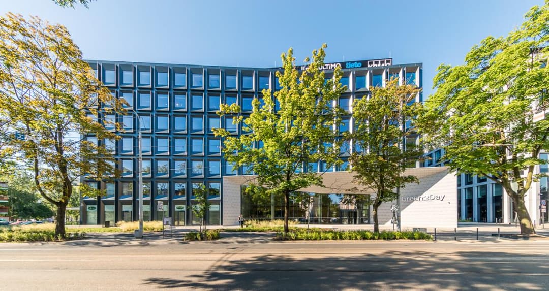 Green2Day is an office building located at Szczytnicka 11 in the Plac Grunwaldzki area of Wrocław, offering a total of 17 600 m² of workspace across seven above-ground floors and two underground levels. The building is designed in a U-shape and features a range of eco-friendly solutions, including energy-efficient lighting, advanced heating and cooling systems, and heat recovery technology for the underground floors. These features have contributed to Green2Day earning a gold LEED certificate and recognition for its accessible design, including the “Lider Dostępności” and “Obiekt bez barier” awards.