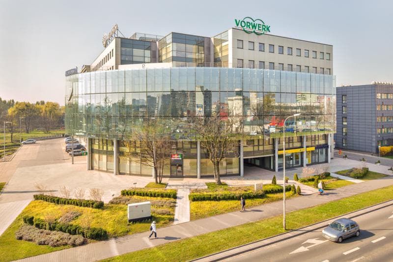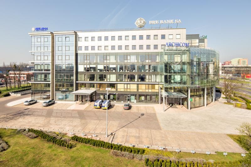Offices are available in a variety of sizes, from 88 m² to 2 470 m², with rents starting at 12,50 EUR per m² and a service charge of 23,70 PLN per m². The building features air conditioning, suspended ceilings, carpeting, and fiber optic internet, plus a security access system for peace of mind.